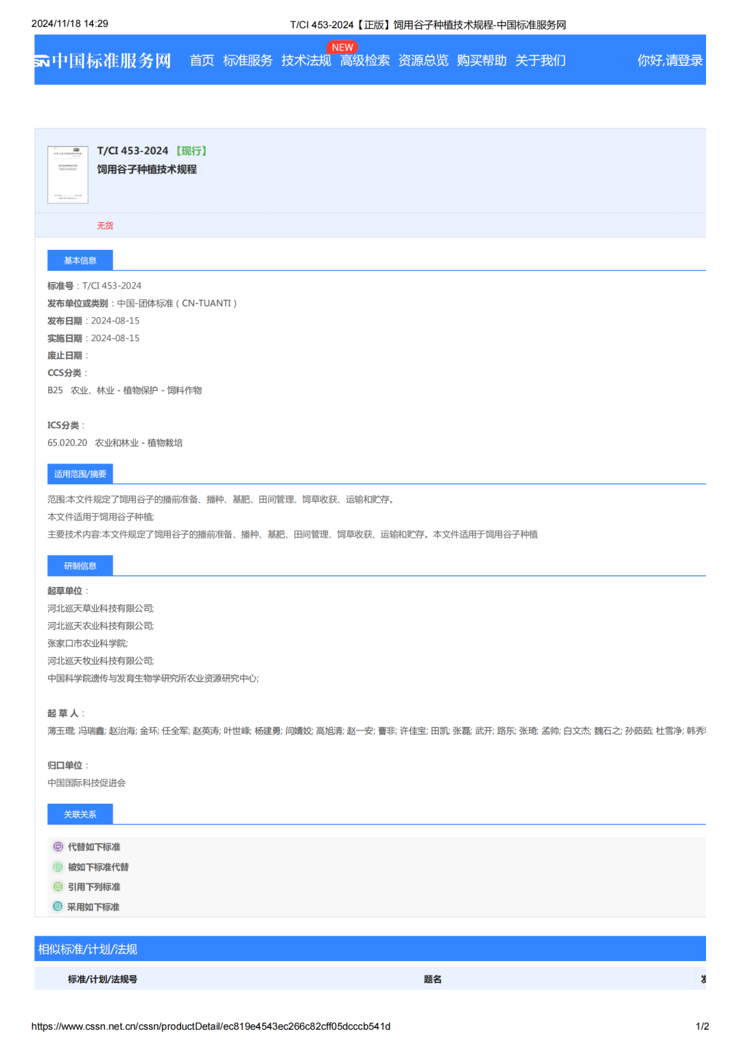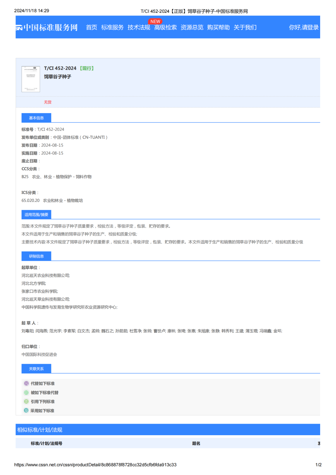 2024年5月,由中國(guó)國(guó)際科技促進(jìn)會(huì)標(biāo)準(zhǔn)化工作委員會(huì)提出,河北巡天農(nóng)業(yè)科技有限公司、河北巡天草業(yè)科技有限公司分別牽頭起草《飼草谷子種子》《飼用谷子種植技術(shù)規(guī)程》兩項(xiàng)團(tuán)體標(biāo)準(zhǔn),張家口市農(nóng)業(yè)科學(xué)院、河北巡天牧業(yè)科技有限公司、中國(guó)科學(xué)院遺傳與發(fā)育生物學(xué)研究所農(nóng)業(yè)資源研究中心、河北北方學(xué)院等參與制定。經(jīng)過(guò)立項(xiàng)、編制起草、征求意見(jiàn)、評(píng)審、修改、審查、批準(zhǔn)及備案等流程,兩項(xiàng)標(biāo)準(zhǔn)于本年8月15日獲得中國(guó)國(guó)際科技促進(jìn)會(huì)標(biāo)準(zhǔn)化工作委員會(huì)批準(zhǔn)實(shí)施,11月16日正式見(jiàn)網(wǎng)(中國(guó)標(biāo)準(zhǔn)服務(wù)網(wǎng):https://www.cssn.net.cn/cssn/index;全國(guó)團(tuán)體標(biāo)準(zhǔn)信息平臺(tái):https://www.ttbz.org.cn/),預(yù)計(jì)本月底將出版見(jiàn)刊。